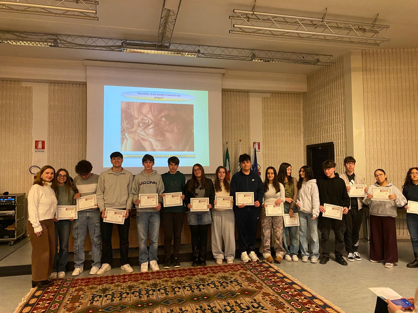 Tre premiazioni, una menzione speciale e tanti attestati di partecipazione sono stati consegnati da Giovanna e Lorenzo, genitori di Lalla, carichi di emozione e gratitudine verso i giovani che hanno partecipato con entusiasmo all’iniziativa. Il primo premio è andato a Carolina Regoli 3E, il secondo a Nabila Refai 3B, il terzo a Giovanna Carloni 4G e la menzione speciale a Tommaso Papa Papini 5Fu (motivazione: “per una lirica che ha il sapore di altri tempi, con un lessico che si ispira a Dante e racconta che anche l’amore… SUCCEDE”).