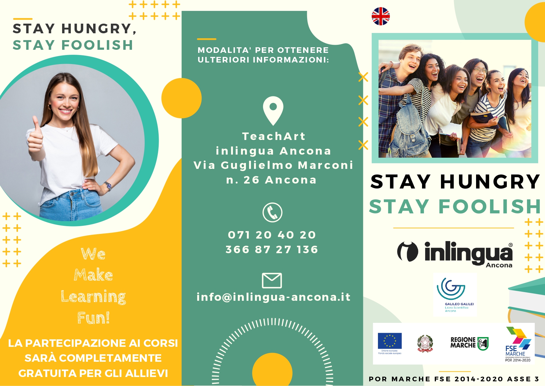 Il nostro istituto è partner della TeachArt srls – Inlingua Ancona per la realizzazione del progetto Stay Hungry, Stay Foolish – “POR Marche FSE 2014-2020 Asse 3, P.d.I. 10.4 R.A. 10.6 DGR n. 496 del 26.4.2021. Avviso pubblico per la presentazione di progetti formativi per la diffusione delle competenze in lingua inglese iscritti alle classi quarte e quinte degli Istituti d’Istruzione secondaria di secondo grado – a.s. 2021/2022 – Provincia di Ancona”.